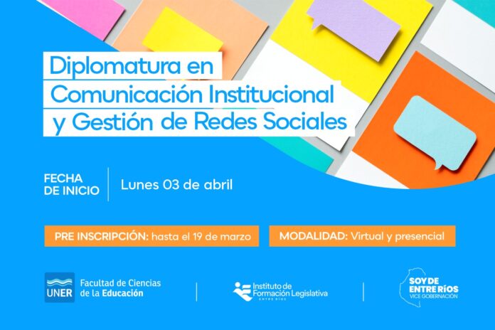 El lunes 3 de abril dará inició la Diplomatura en Comunicación Institucional y Gestión de Redes Sociales a cargo del equipo docente de la Facultad de Ciencias de la Educación de la UNER, y tiene como objetivos que sus egresados generen herramientas para analizar e integrar la comunicación digital en la gestión de la comunicación institucional de organizaciones públicas y de la sociedad civil, impulsar el desarrollo de criterios claros y estrategias integrales para la gestión, contribuyendo al desarrollo del posicionamiento y la reputación de las organizaciones promoviendo principalmente la transparencia institucional.Está destinada a integrantes de equipos de comunicación del ámbito público, organizaciones civiles, estudiantes de comunicación/periodismo interesados en la temática. Cursado y contenido