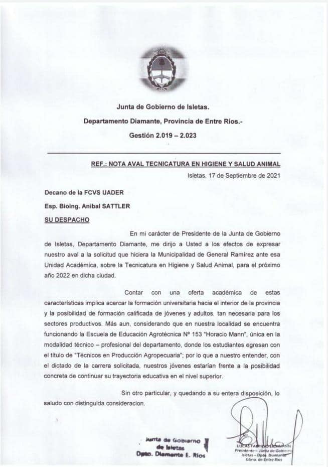 «Desde la Junta de Gobierno en el mes de septiembre acompañamos la gestión de la Municipalidad de General Ramírez en la que se solicitaba al Decano de la FCVS, bioingeniero Aníbal Sattler, la incorporación de esta oferta educativa, argumentando que implicaba acercar la formación universitaria a jóvenes y adultos de la Provincia, y más aún a nuestra región, donde contamos con la única Escuela del Departamento Diamante de Formación Técnico – Profesional con modalidad agropecuaria«, expresaron desde el ente gubernamental isletense.