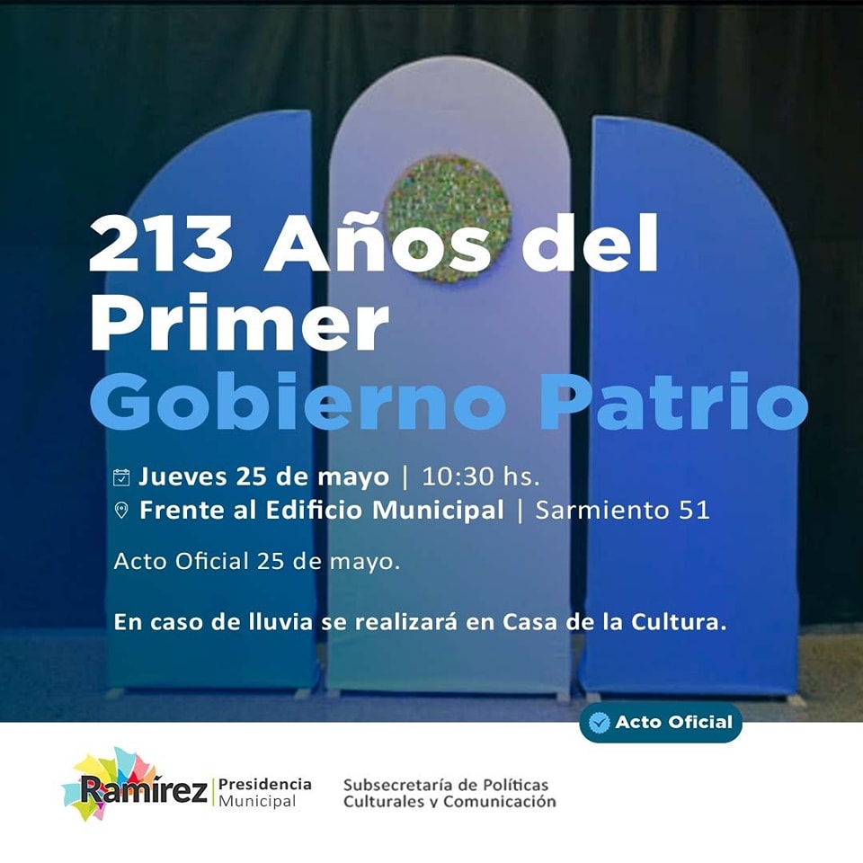 En General Ramírez, departamento Diamante, el acto por el 213 aniversario de la Revolución de Mayo se realizará este jueves desde las 10.30. Sino llueve se hará frente al edificio municipal y en caso se lluvia, se trasladará a la Casa de la Cultura.