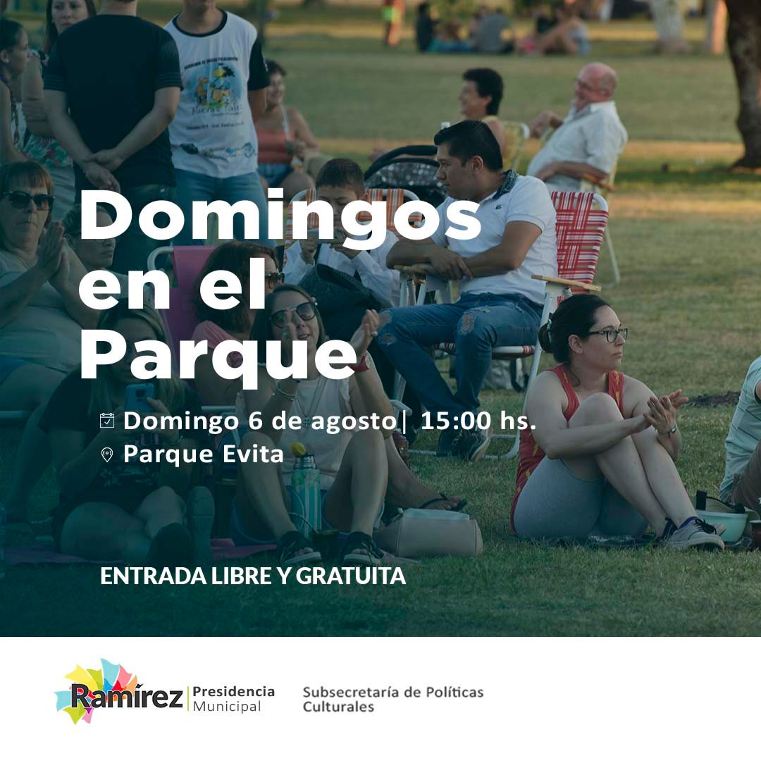 Este domingo 6 de agosto, desde las 15.00, en General Ramírez se realizará una nueva edición de «Domingos en el Parque» en el predio del Parque Evita, en inmediaciones de la estación de ómnibus de esa ciudad.
