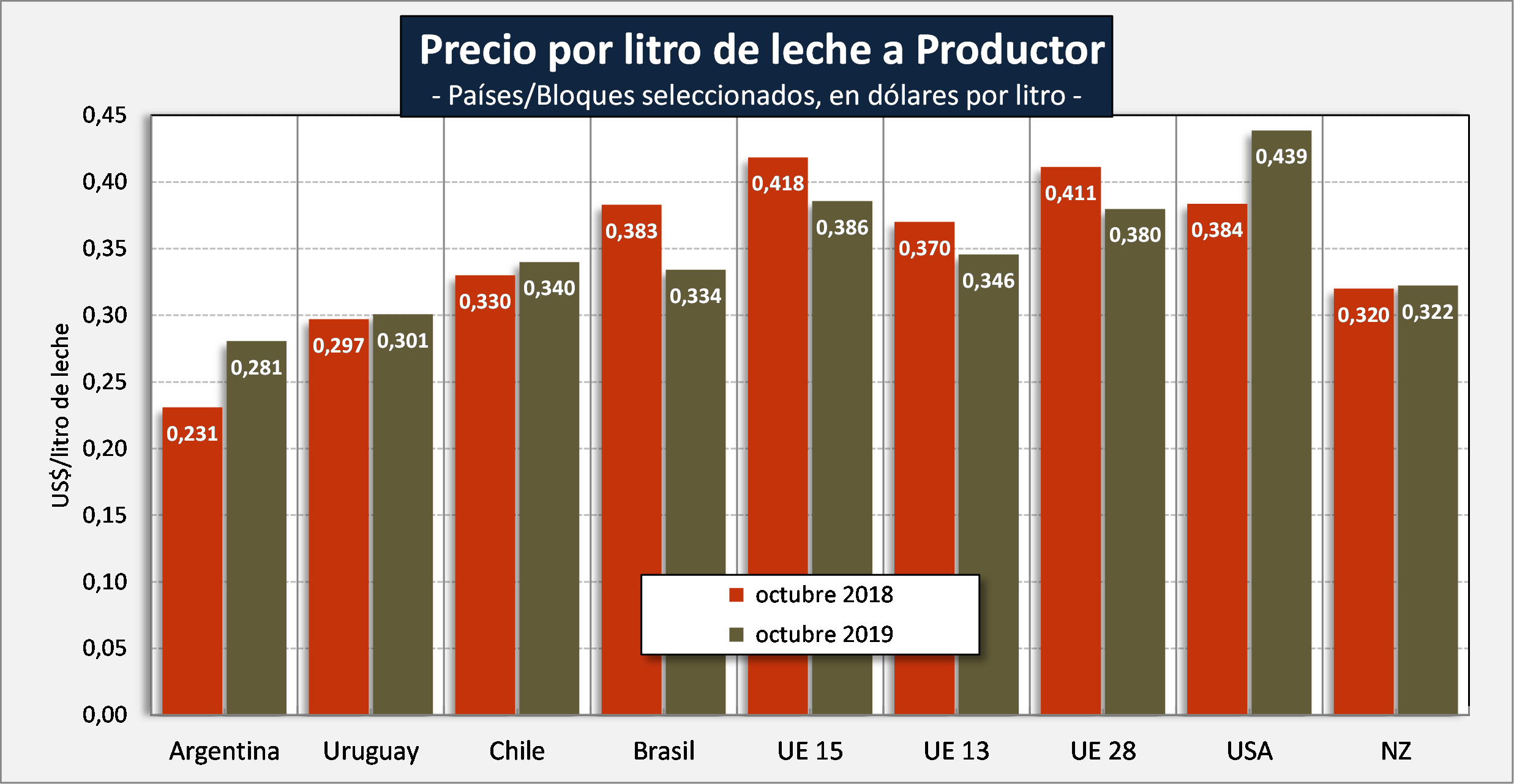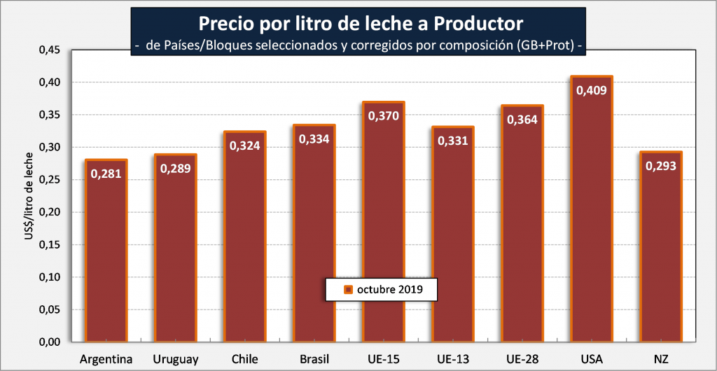 Según los gráficos, en octubre de 2019 se le pagó al productor argentino 0,281 centavos de dólar por cada litro de leche cruda, mientras que en Uruguay y Nueva Zelanda el litro supera los 0,3 u$s/lt.