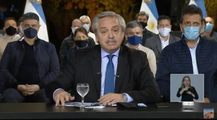 Rodeado de ministros, el gobernador Axel Kicillof e intendentes de Buenos Aires, el presidente Alberto Fernández brindó un discurso repudiando el accionar de la Policía bonaerense, que rodeó con agentes armados la Quinta de Olivos protestando por un reclamo salarial.