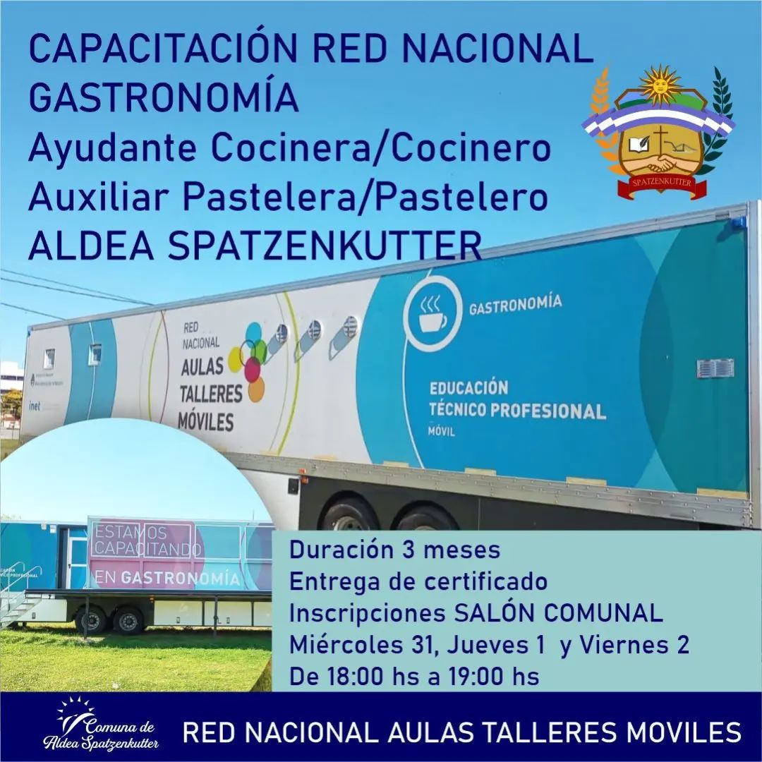 La Comuna de Spatzenkütter anunció la capacitación “Red Nacional Gastronomía”, en el marco de la “Red Nacional Aulas Talleres Móviles”, para aprender a ser Ayudante de cocinera/cocinero y Auxiliar de Pastelera/Pastelero.