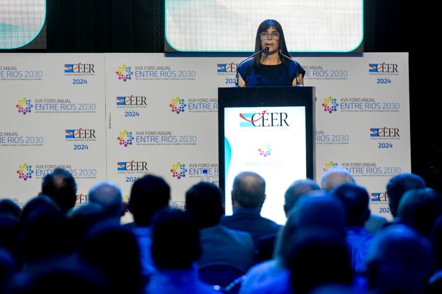 Al hacer uso de la palabra, la vicegobernadora de la Provincia, Alicia Aluani, agradeció la invitación a participar en la nueva edición del Foro y manifestó: “Para el gobierno entrerriano, esta instancia representa una ocasión invaluable para reflexionar sobre los avances logrados y las dificultades que hemos enfrentado en el último año. Esta mirada retrospectiva no sólo nos permite identificar los desafíos que aún quedan por abordar, sino que también nos impulsa a pensar en un futuro prometedor. Este Foro nos brinda la oportunidad de analizar nuestra realidad actual, considerando la coyuntura que estamos atravesando, pero sin perder de vista los ejes y las políticas que hemos establecido como parte de nuestra gestión para el desarrollo sostenible de nuestra provincia”.