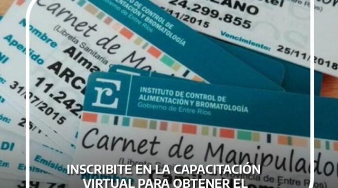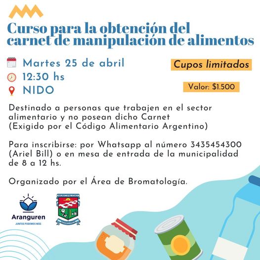 En la localidad de Aranguren, departamento Nogoyá, brindarán un curso para la obtención del Carnet de Manipuladores de Alimentos. Será el martes 25 de abril a las 12.30 en el Núcleo de Innovación y Desarrollo de Oportunidades -NIDO-.