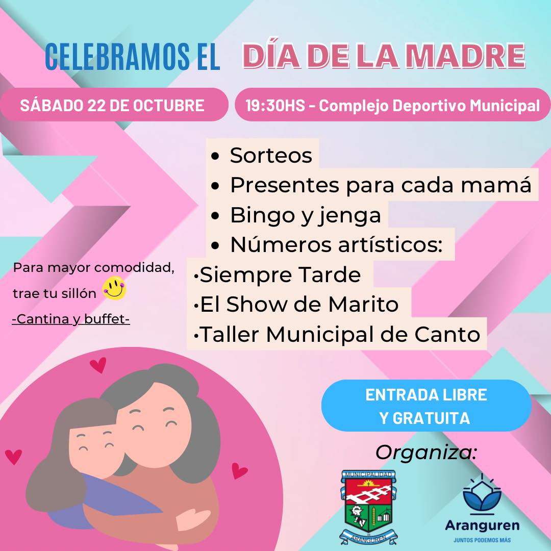 Este sábado 22 de octubre se celebrará el Día de la Madre en Aranguren. Será desde las 19.30 en el Complejo Deportivo Municipal y habrá sorteos, presentes para cada mamá, bingo y jenga.