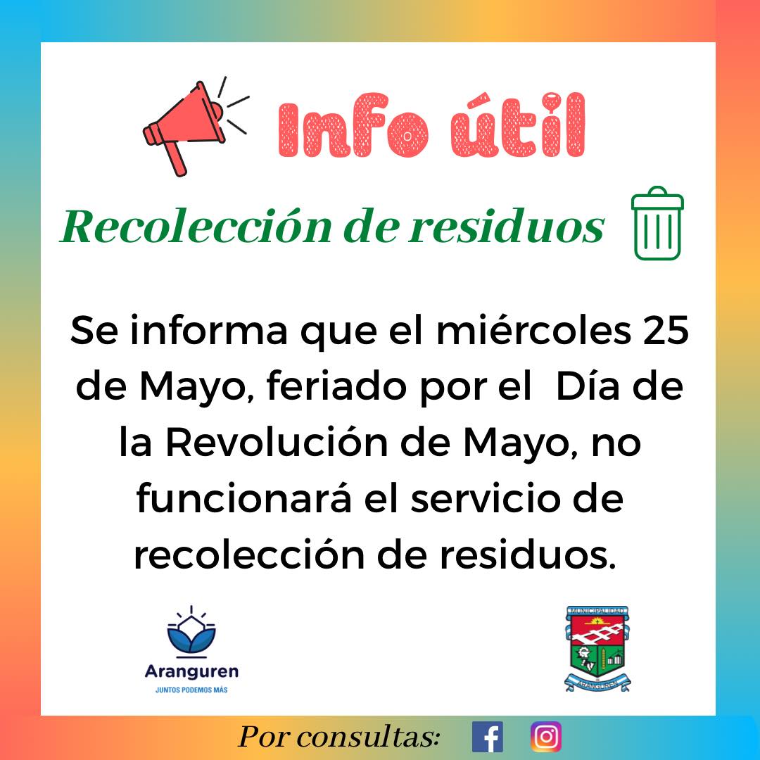 Como es habitual en estas fechas y al igual que en la mayoría de las ciudades, este miércoles 25 de mayo no habrá recolección de residuos en la localidad de Aranguren.