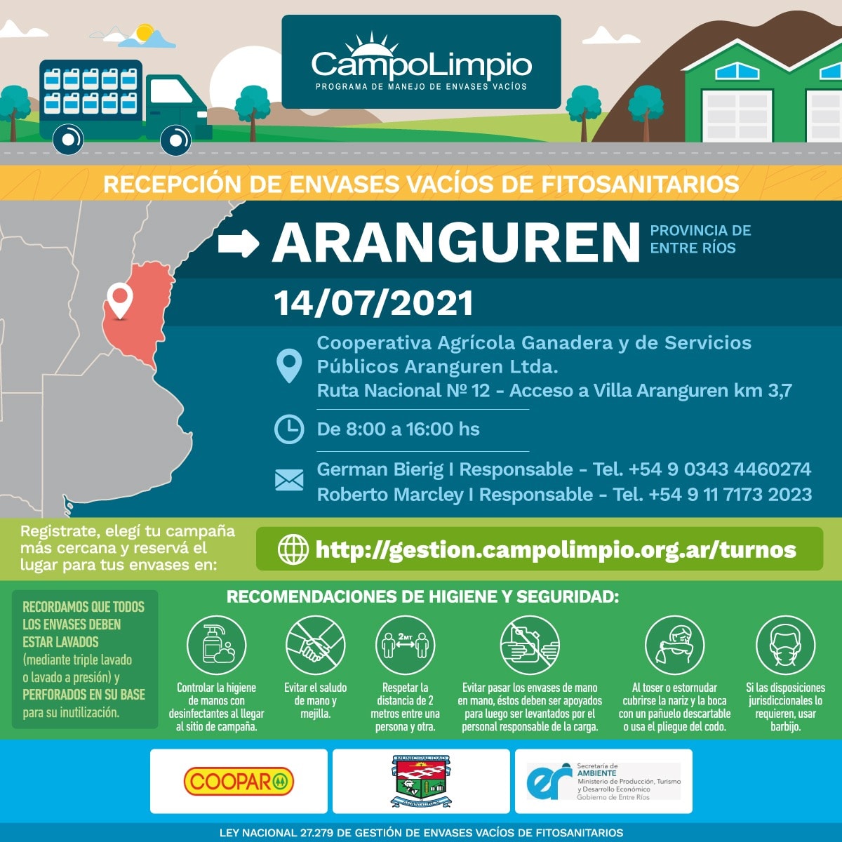 En las instalaciones de Cooperativa Aranguren se realizará una campaña de recolección de envases de fitosanitarios, este miércoles 14 de julio de 8 a 16.
