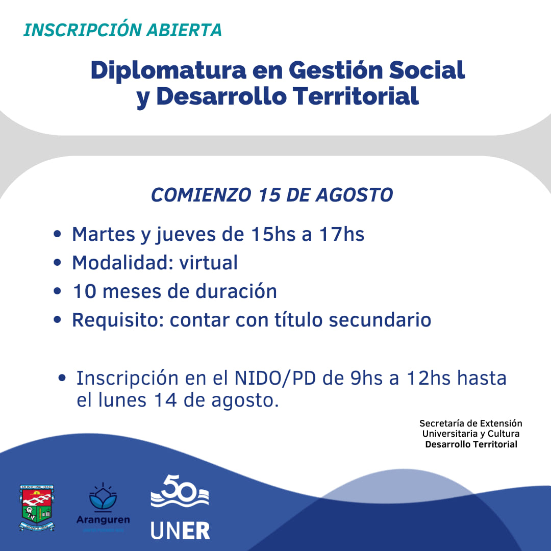 En la localidad de Aranguren, departamento Nogoyá, está abierta la inscripción para la Diplomatura en Gestión Social y Desarrollo Territorial de la Universidad Nacional de Entre Ríos -UNER-.