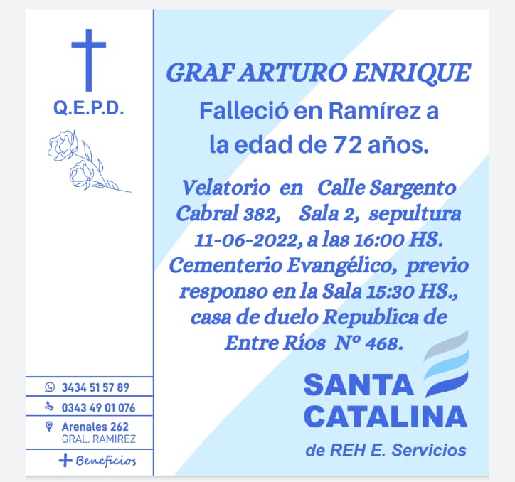 Falleció en Ramírez a los 72 años, Arturo Enrique Graff.