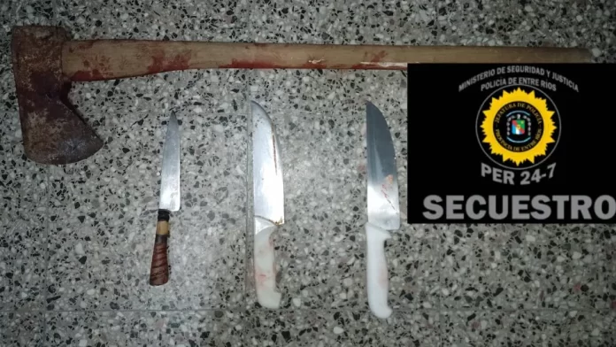 Con la premura del caso, acudieron mas efectivos policiales. El funcionario comentó: «La moradora manifestó que su pareja la había agredido físicamente y también había lastimado a un hermano de ella, con un arma blanca. Se hallaba en actitud violenta un joven de 27 años, quien tenía en su poder un hacha y dos cuchillos de buen tamaño de hoja, siendo inmediatamente reducido».