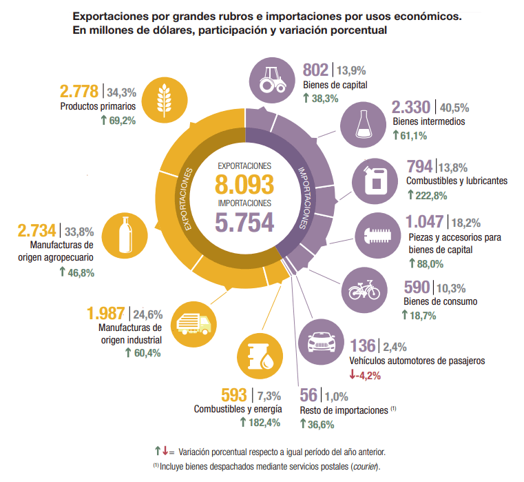 Estos datos positivos de las ventas argentinas en agosto fueron acompañados por un aumento del 64% de las importaciones que alcanzaron un valor de 5.754 millones de dólares, con lo cual el intercambio comercial argentino alcanzó los 13.847 millones de dólares y el saldo comercial de nuestro país en el octavo mes de este año fue de 2.339 millones de dólares.