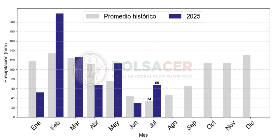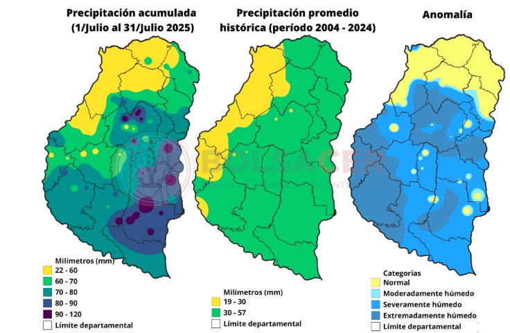El promedio provincial de precipitaciones en julio fue de 68 mm, lo que representa un aumento del 100% respecto al promedio histórico para el mes, que es de 34 mm. Este considerable incremento se traduce en una diferencia absoluta de 34 mm sobre la referencia histórica.