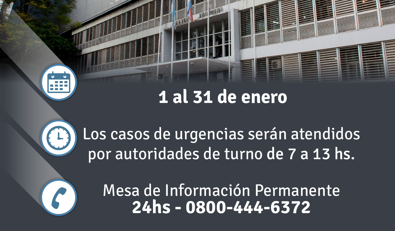Cesarán en ese lapso las actividades ordinarias del Poder Judicial de Entre Ríos. Pero los casos de urgencia serán atendidos por integrantes de la magistratura, del funcionariado y empleados/as que prestarán servicio durante toda la mañana, en el habitual horario de 7 a 13. Además, se podrán efectuar consultas telefónicas gratuitas a través de la línea de alcance nacional para atención ciudadana: 0800-444-6372.