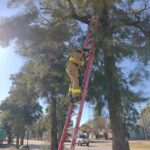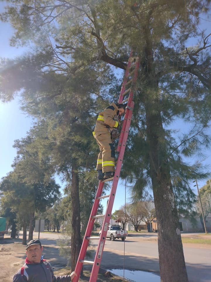 Las horas pasaban, hacía frio y el pequeño travieso seguía ahí, a varios metros de altura. La familia no tenía forma de rescatarlo, más que mirarlo desde el piso, hasta que aparecieron ellos, los hombres de amarillo, los Bomberos Voluntarios de General Ramírez.