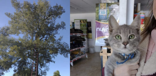 Bomberos Voluntarios de Ramírez tuvieron que rescatar un gatito de un árbol
