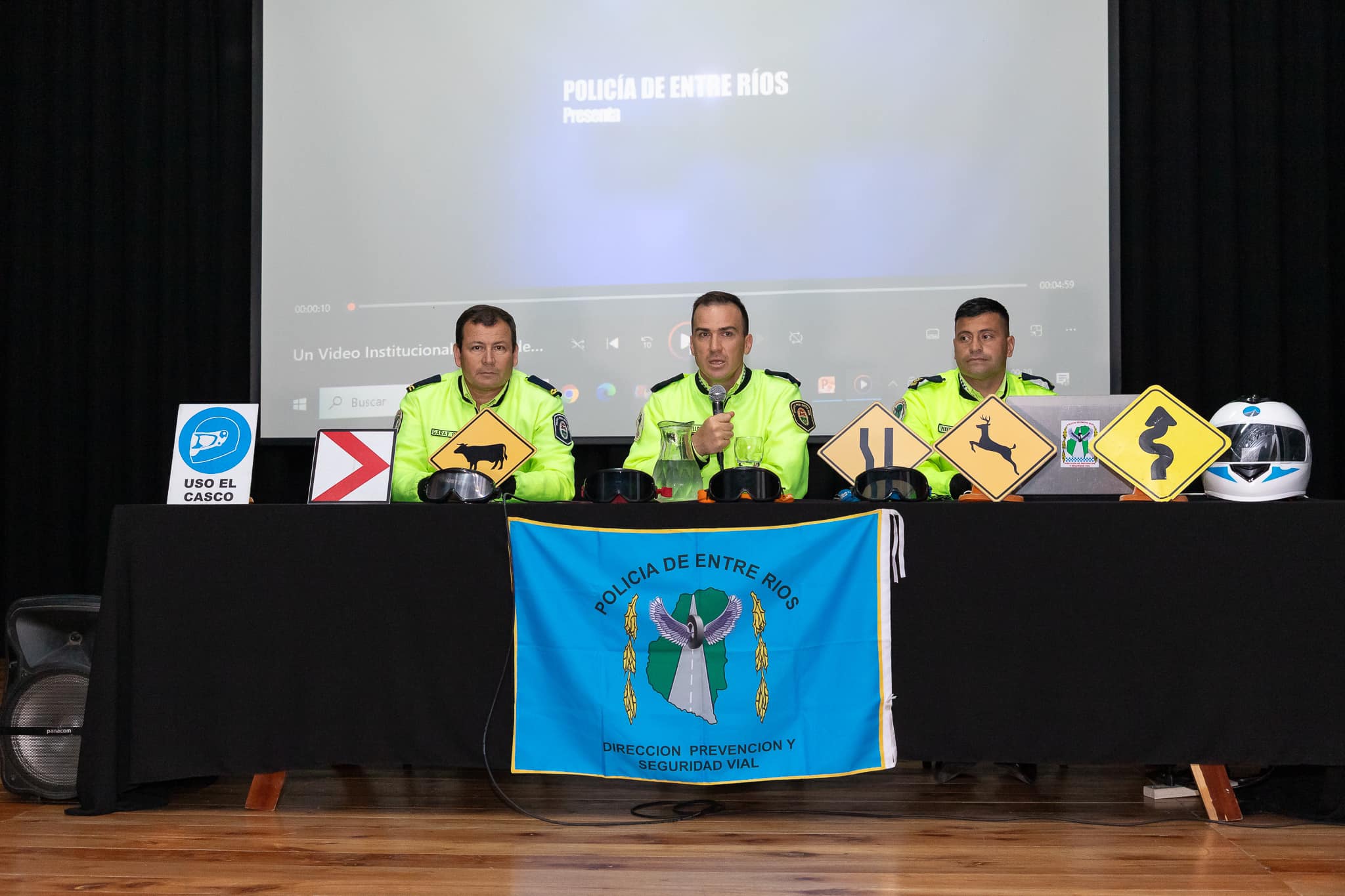 En la oportunidad, acompañaron a Borghello durante la charla, el Suboficial Mayor Francisco Garay y el Sargento Santiago Pereyra de la Dirección de Prevención y Seguridad Vial de la Policía de Entre Ríos.
