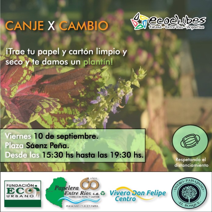 Ecoclub Paraná invita a los vecinos a sumarse a un nuevo canje de papel y cartón, por plantines. En esta oportunidad lo realizarán el viernes 10 de septiembre desde las 15:30 hasta las las 19:30, en plaza Sáenz Peña, esquina Enrique Carbó y Arturo Ilia, en la capital entrerriana.