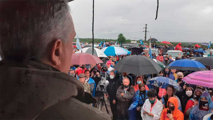 Pese a la intensa lluvia, llegaron productores de gran parte de la provincia. En el lugar en un acoplado de levantó una especie de palco cubierto con todos de camión. La cobertura que fue seguida por medios de la región, la provincia y a nivel nacional, tomó las principales palabras de los que se consideran afectados. Juan Diego, Sebastián, Luis Miguel y Leonor Etchevehere se pararon ante la concurrencia que tenía solamente banderas argentinas.