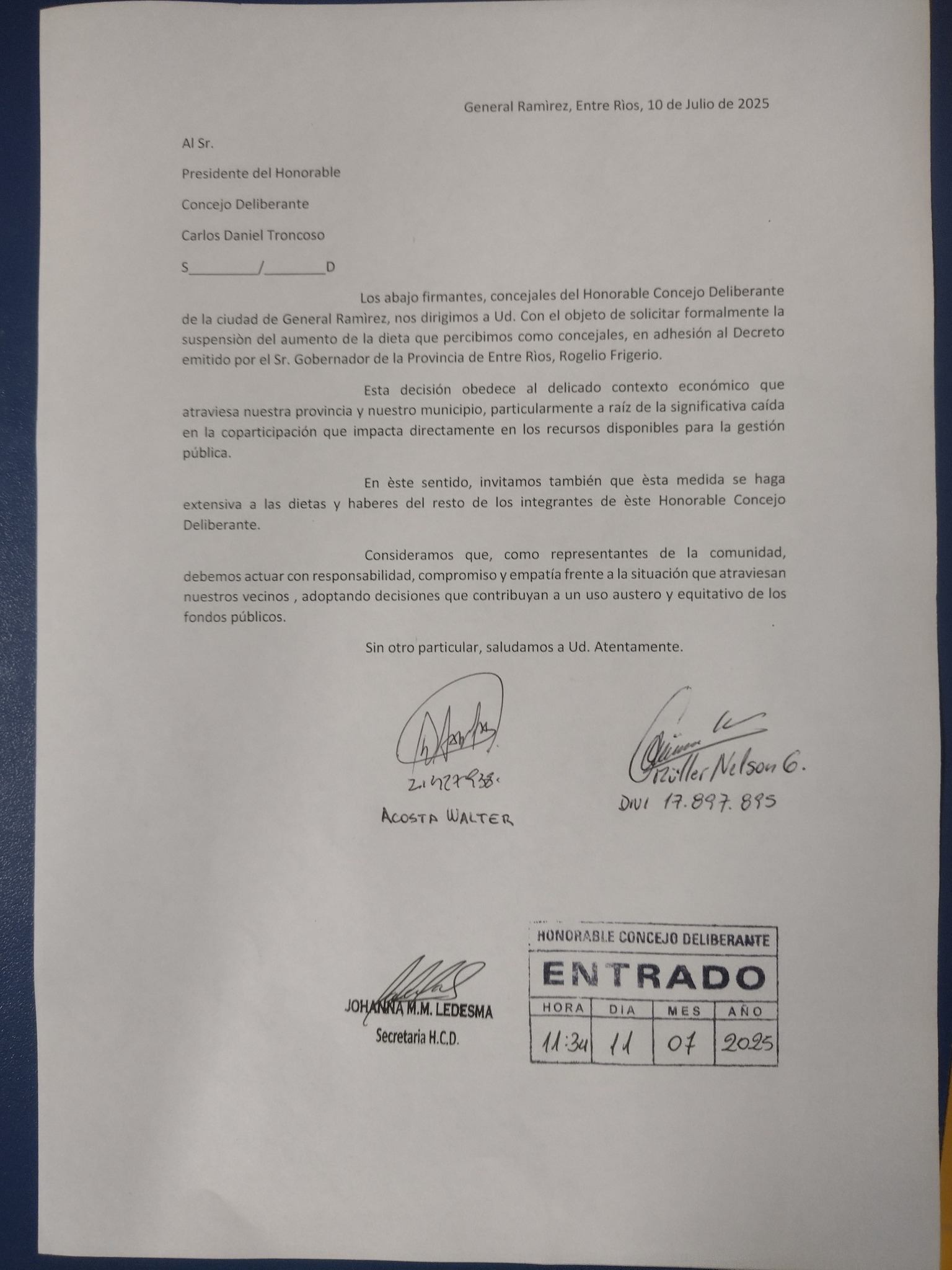 En General Ramírez, un grupo de concejales oficialistas pero que internamente responden al exintendente y actual senador, Gustavo Vergara, solicitaron la «suspensión del aumento de la dieta», que perciben como ediles de esa ciudad del departamento Diamante.