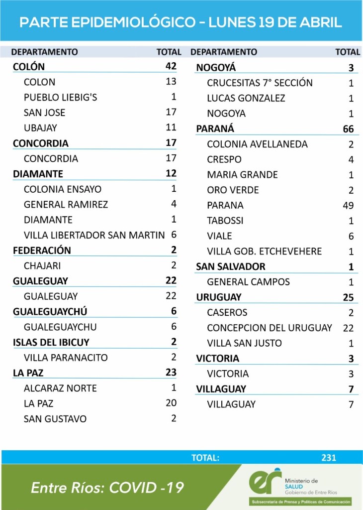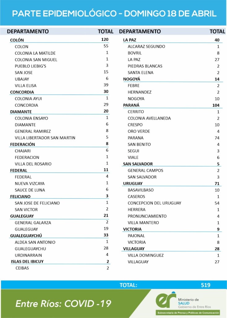 Paraná (123) y Concepción del Uruguay (76) son las ciudades que más casos reportaron entre este domingo y lunes. Esta vez el departamento Paraná registró el número más elevado de casos en 48 horas con 170 positivos.