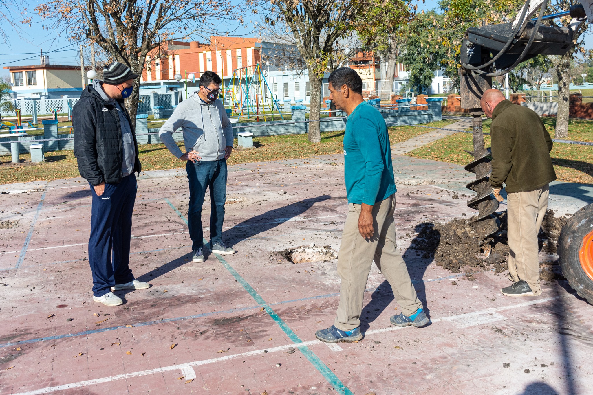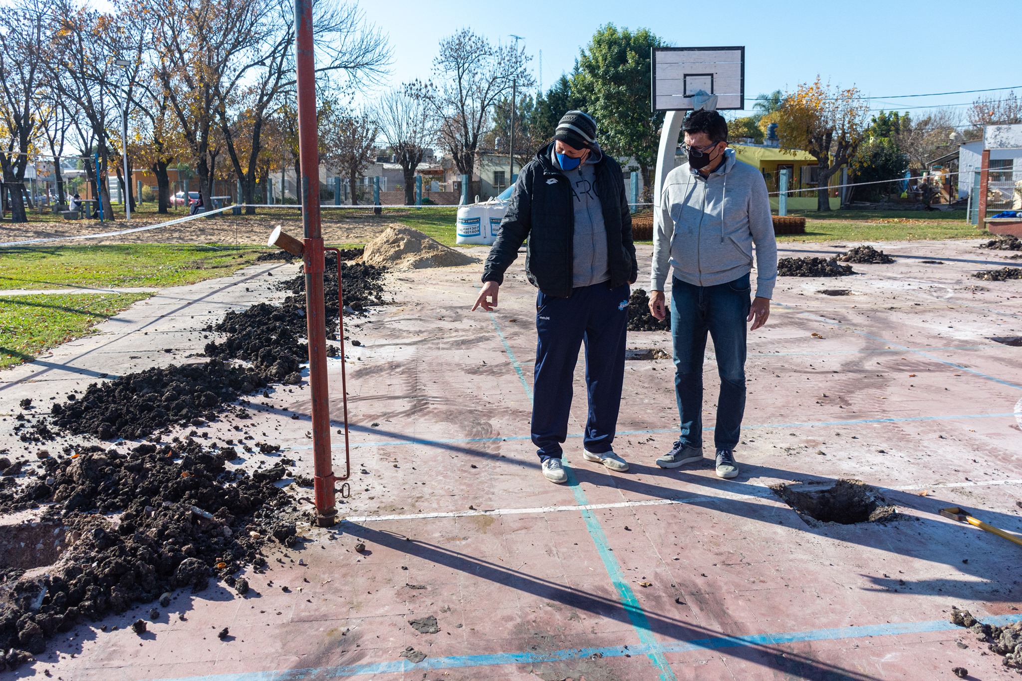El intendente Gustavo Vergara, acompañado por el director de Deportes Cesar Omarini, recorrieron el inicio de los trabajos que una vez concluida se transformará en la cancha auxiliar de básquet.