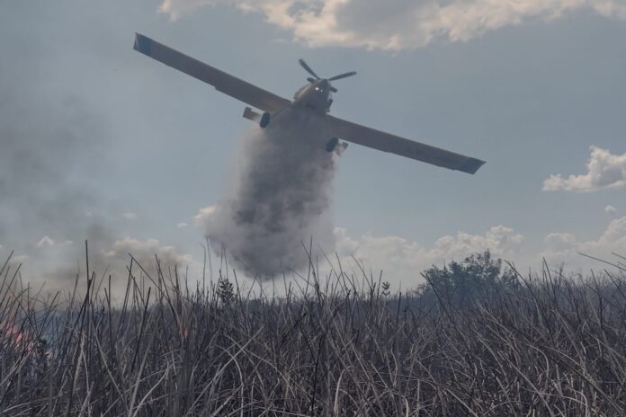 El comando, constituido en el Club Náutico Bartolomé Mitre, realiza tareas de combate con la colaboración de medios aéreos provistos por el Servicio Nacional de Manejo del Fuego.