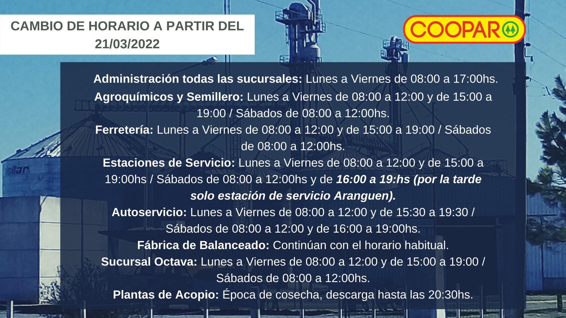 Como es habitual con el cambio de estación, Cooperativa Agrícola Ganadera y de Servicios Públicos Aranguren Limitada –Coopar– modifica sus horarios de atención en las diferentes secciones.