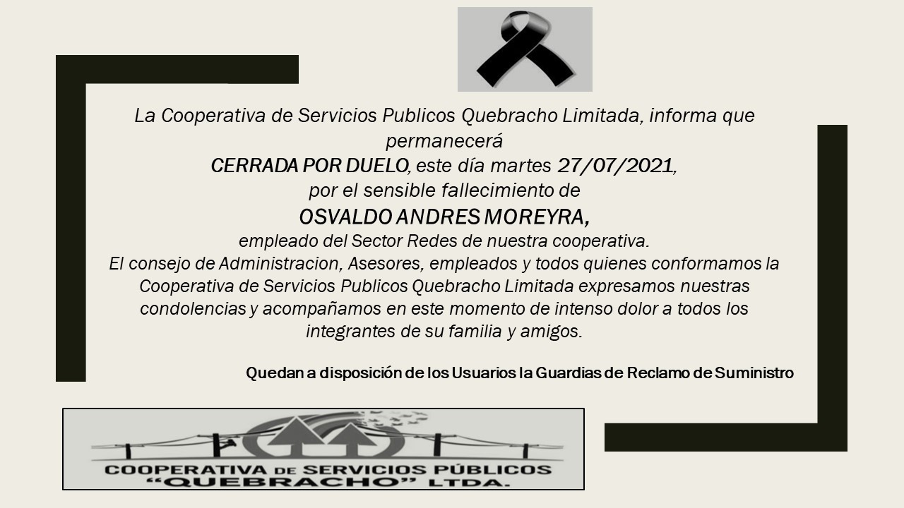 Las oficinas de la Cooperativa de Servicios Públicos Quebracho Limitada permanecerán cerradas por duelo durante este martes 27 de julio.
