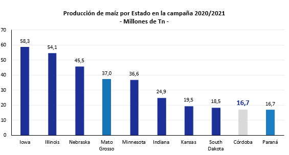 El 75% de las exportaciones mundiales de maíz se concentran entre Estados Unidos, Brasil y Argentina, y en ese marco, la provincia de Córdoba ocupa un rol esencial, dado que es la primera productora a nivel nacional y se ubica en el top diez de estados con mayor producción dentro de dichos países.
