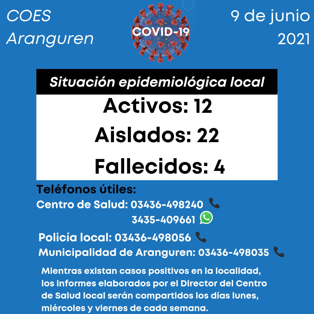 En la localidad de Aranguren son 12 los casos activos de Covid-19 a este miércoles 9 de junio. En tanto, las personas que deben cumplir con el aislamiento son 22, según los datos proporcionados por el sistema de salud local.