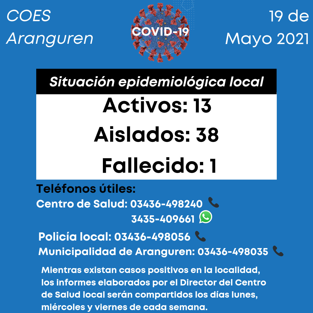 En la localidad de Aranguren son 13 los casos activos de Covid-19 al miércoles 19 de mayo. En tanto, las personas que deben cumplir con el aislamiento son 38 y se suma el primer paciente fallecido, según los datos proporcionados por el sistema de salud local.