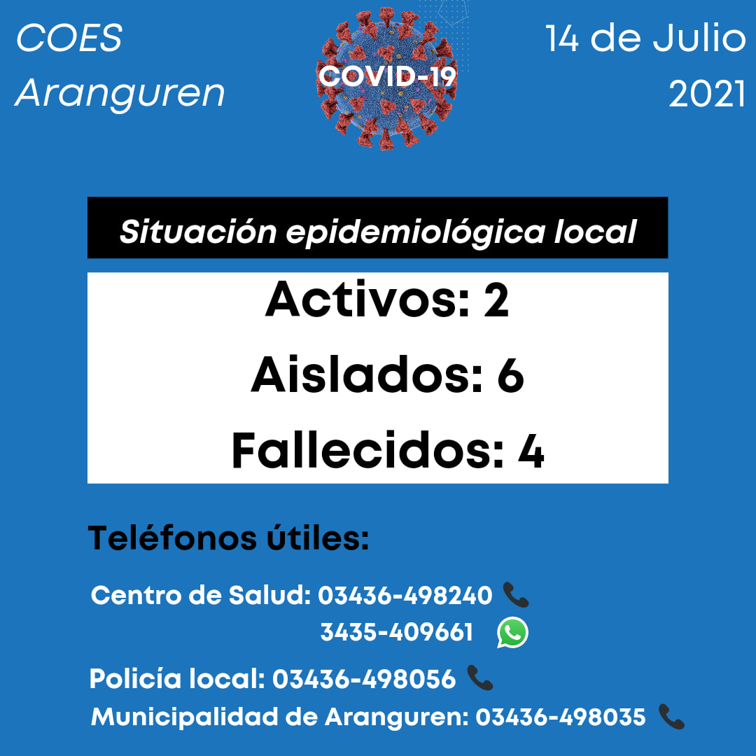 En la localidad de Aranguren son solamente dos los casos activos de Covid-19 a este miércoles 14 de julio. En tanto, las personas que deben cumplir con el aislamiento son seis, según los datos proporcionados por el sistema de salud local.