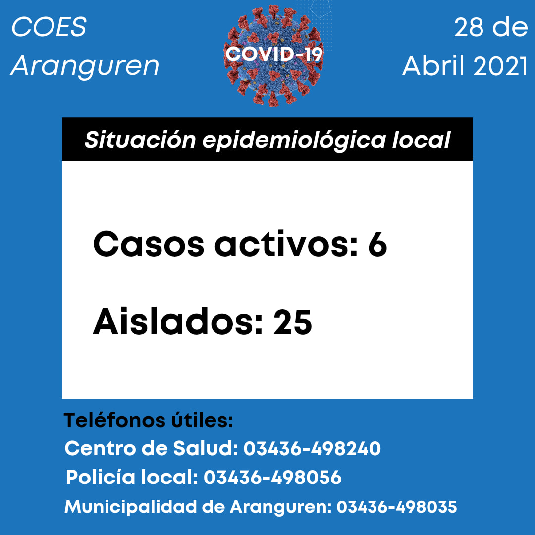 En la localidad de Aranguren son seis los casos activos de Covid-19 al miércoles 28 de abril. En tanto, las personas que deben cumplir con el aislamiento son 25, según los datos proporcionados por el sistema de salud local.