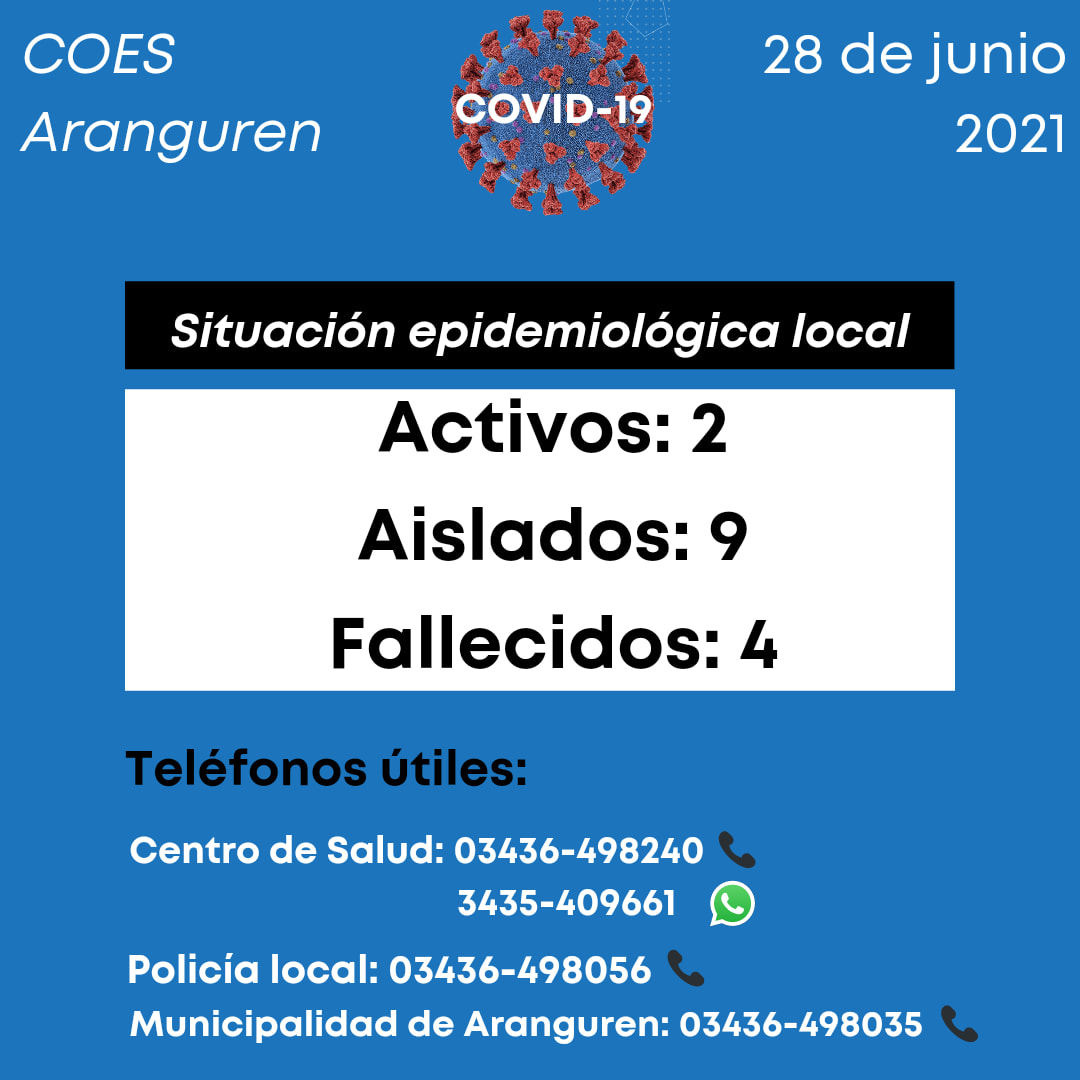 En la localidad de Aranguren son solamente dos los casos activos de Covid-19 al lunes 28 de junio. En tanto, las personas que deben cumplir con el aislamiento son nueve, según los datos proporcionados por el sistema de salud local.