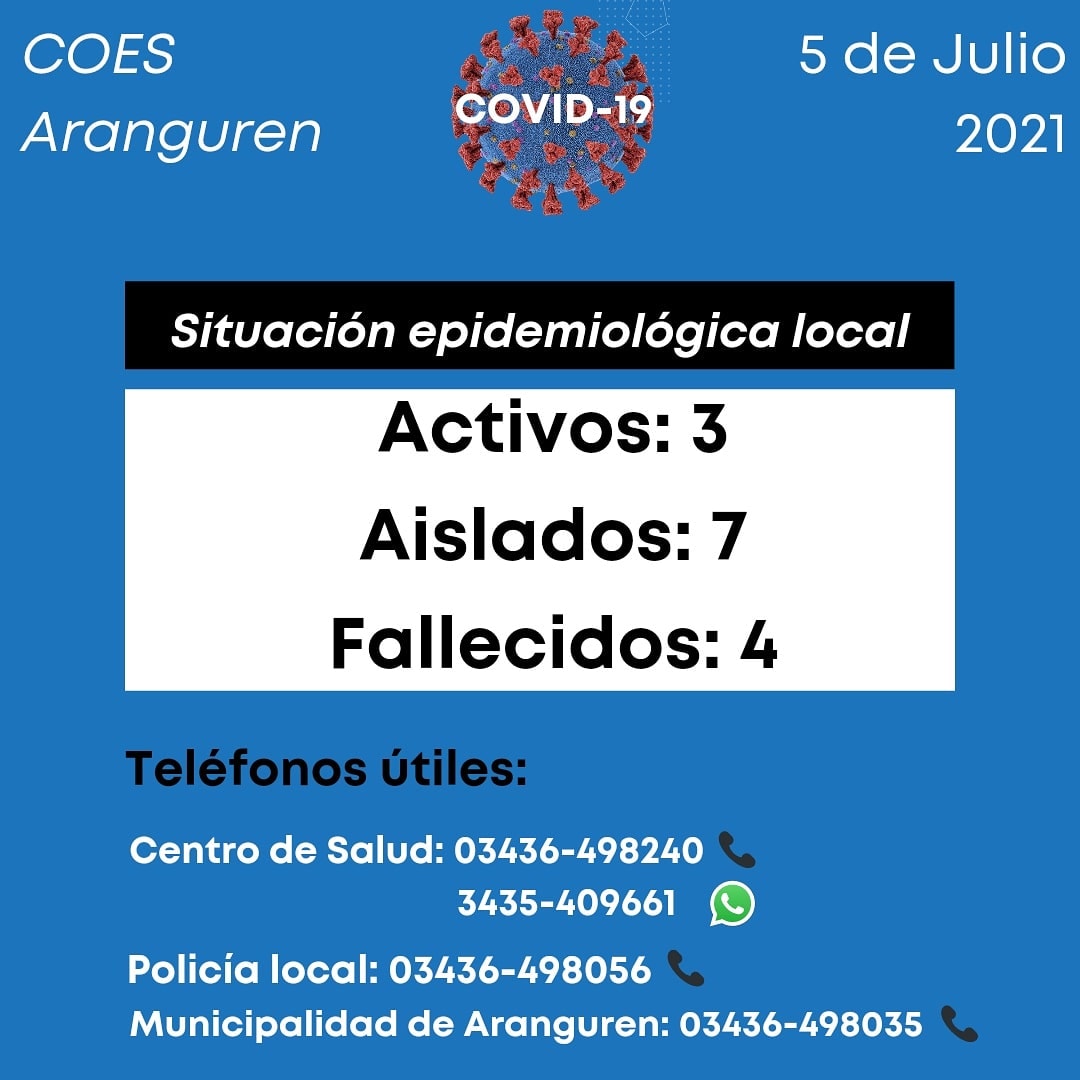 En la localidad de Aranguren son solamente tres los casos activos de Covid-19 a este lunes 5 de julio. En tanto, las personas que deben cumplir con el aislamiento son siete, según los datos proporcionados por el sistema de salud local.