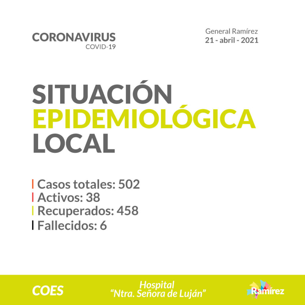 Según datos proporcionados por el sistema de salud a través del Hospital, Nuestra Señora de Luján, en Ramírez se han sumado 34 casos de Covid-19 y hubo 16 altas desde el anterior informe.