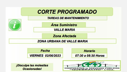Este viernes 2 de junio habrá un corte de energía eléctrica en la zona urbana de Valle María, departamento Diamante. El mismo fue programado por Cooperativa de Servicios Públicos Quebracho Limitada de 07.30 a 08.30.