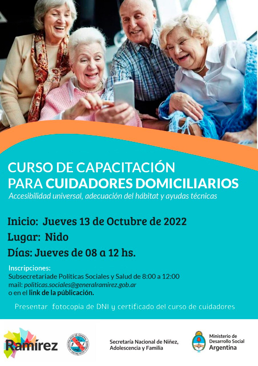 En General Ramírez, se dictará un curso para cuidadores domiciliarios. «Accesibilidad universal, adecuación del hábitat y ayudas técnicas», comenzará este jueves 13 de octubre en el Núcleo de Innovación y Desarrollo de Oportunidades –Nido– y se dictará de 08.00 a 12.00.