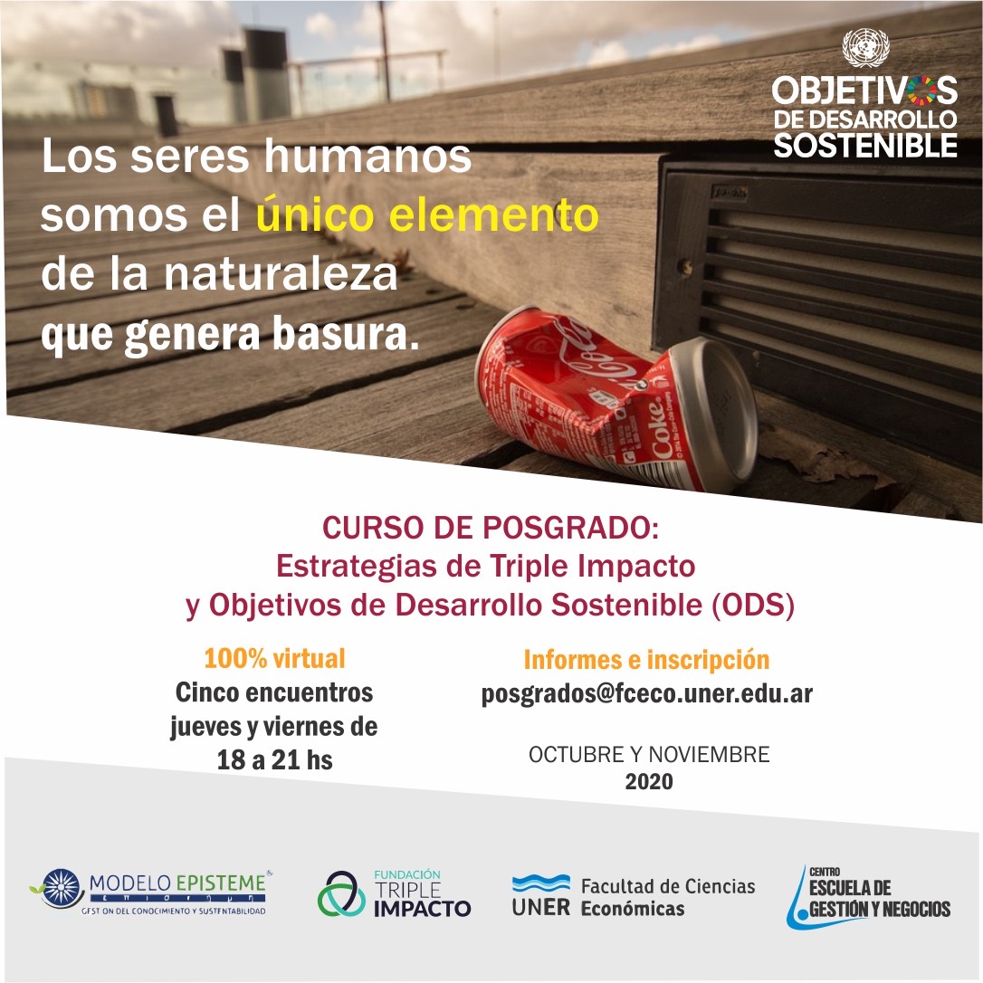 La Fundación Triple Impacto y Modelo Episteme invitan a participar del curso de posgrado “Estrategias de Triple Impacto y ODS” organizado junto a la Escuela de Gestión y Negocios de la Facultad de Ciencias Económicas de la Universidad Nacional de Entre Ríos (UNER). La propuesta, que se dictará de manera virtual, consta de cinco encuentros los jueves y viernes de 18 a 21, cada quince días; comenzando el próximo 29 de octubre.