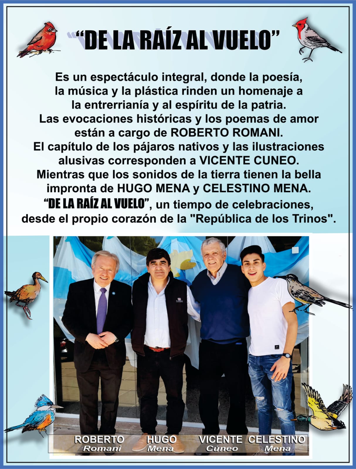 «De la raíz al vuelo» es un espectáculo integral que rescata el valor por la poesía, la plástica y la música; combinando estos géneros para rendir homenaje a la entrerrianía y al espíritu de la patria, siendo los estudiantes, docentes y vecinos en general los destinatarios.