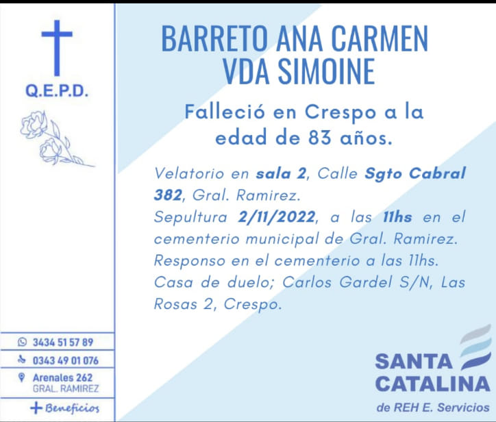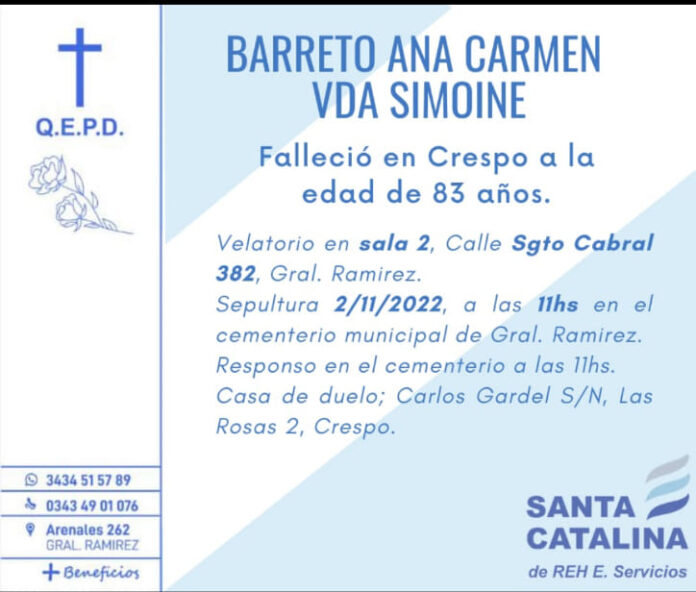 Falleció en Crespo a los 83 años, Ana Carmen Barreto viuda de Simoine.