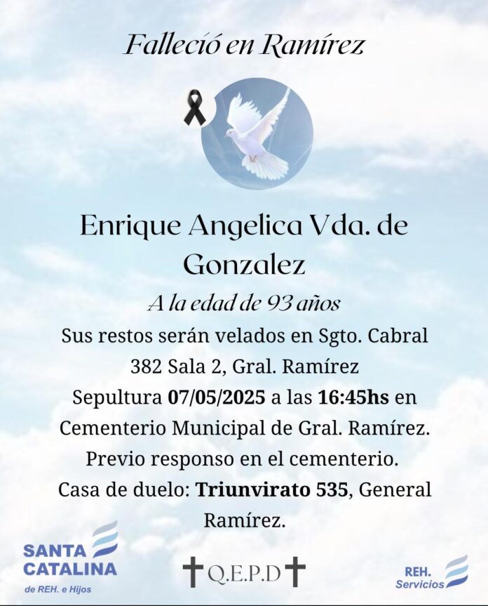 Falleció en General Ramírez a los 93 años, Angelica Enrique Vd. de González.