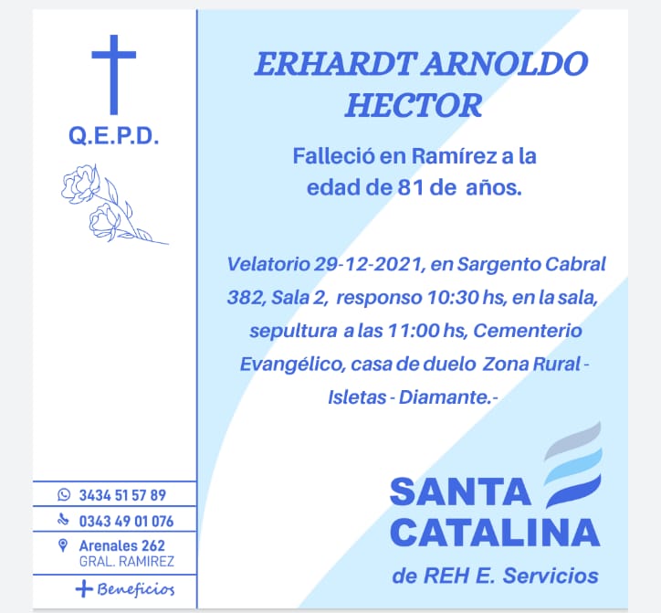 Falleció en Ramírez a los 81 años, Arnoldo Héctor Erhardt.