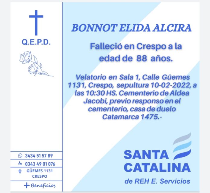 Falleció en Crespo a los 88 años, Elida Alcira Bonnot.