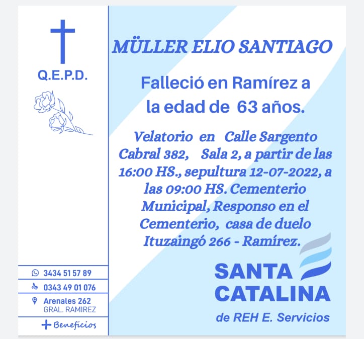 Falleció en Ramírez a los 63 años, Elio Santiago Muller.
