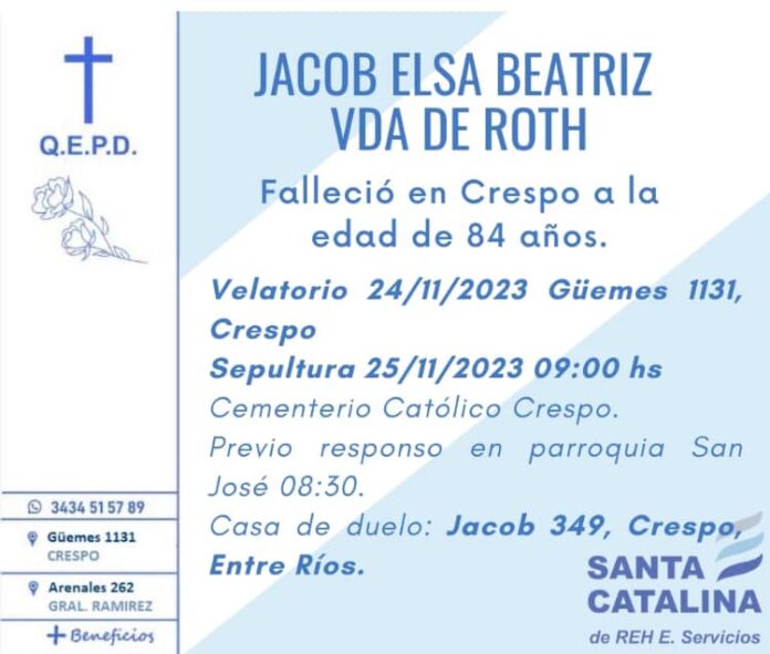 Falleció en Crespo a los 84 años, Elsa Beatriz Jacob viuda de Roth.