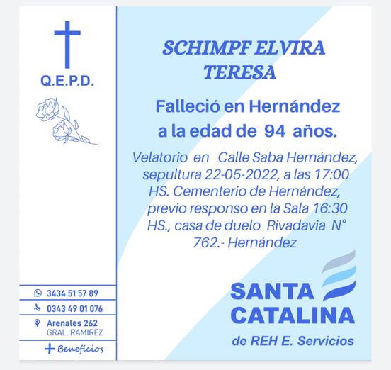 Falleció en Hernández a los 94 años, Elvira Teresa Schimpf.