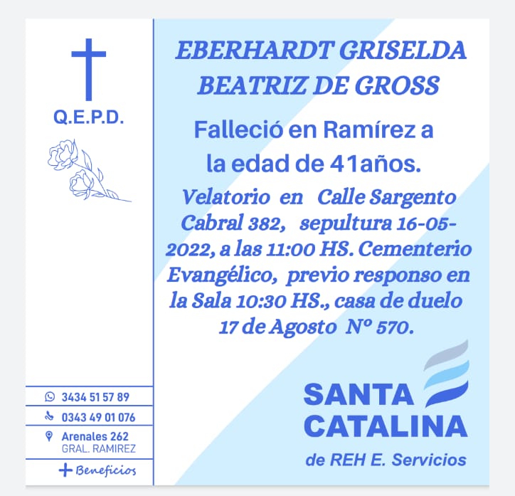 Falleció en Ramírez a los 41 años, Griselda Beatrz Eberhardt de Cross.
