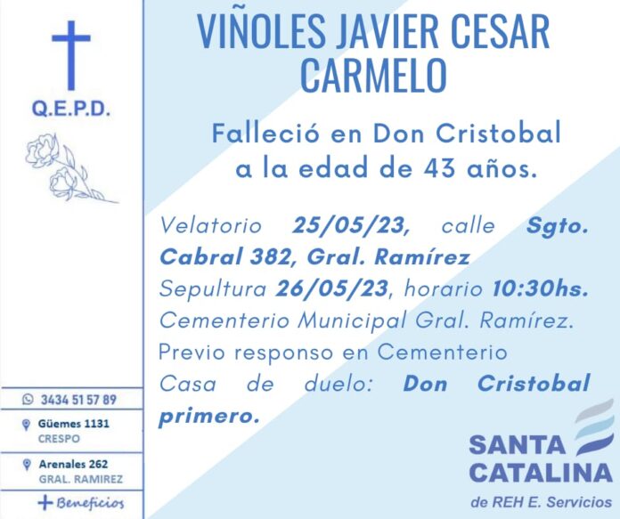 Falleció en Don Cristóbal 1ª a los 43 años, Javier Cesar Viñoles Carmelo.